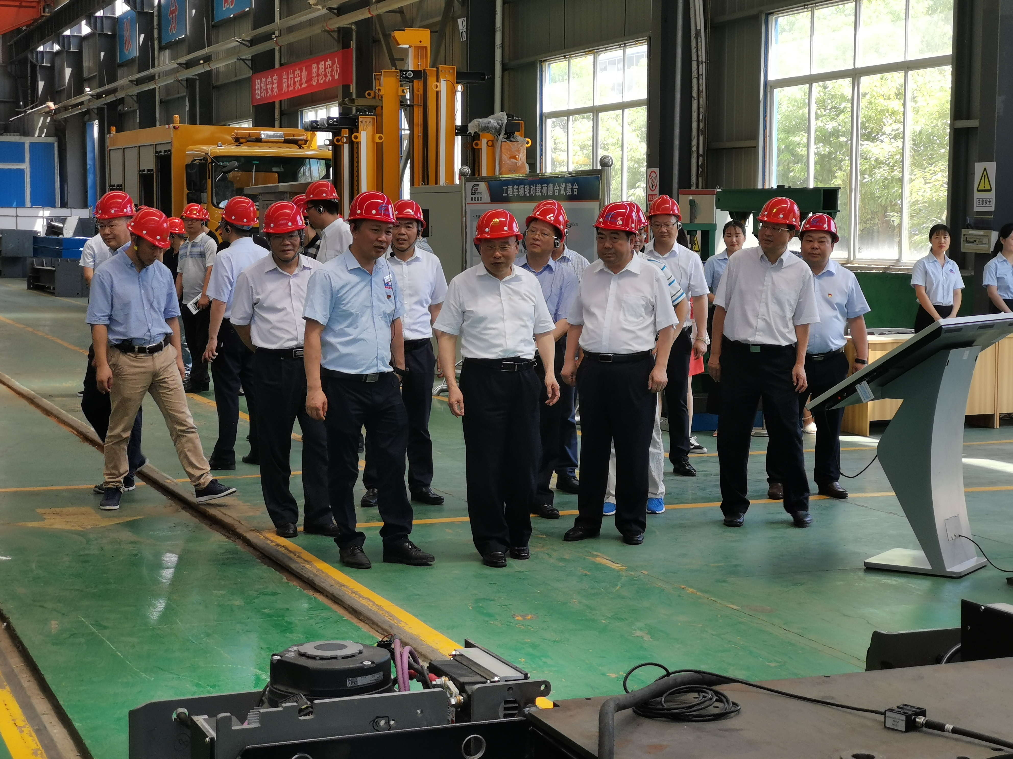 張清杰校長、李德璋副市長等一行走出展廳步入生產(chǎn)車間,邊走邊看,不時詢問生產(chǎn)操作人員和技術(shù)人員,在新產(chǎn)品研發(fā)車間參觀了“輪對、受電弓在線激光檢測系統(tǒng)”、“公鐵兩用車”等創(chuàng)新產(chǎn)品。